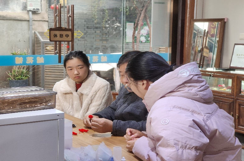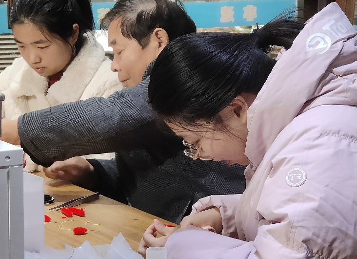 拜访不仅是一次访谈,更是一场沉浸式的体验。钱凤池向师生们细致讲述了绒花的历史与工艺精髓,而两位同学则有幸在大师的亲手指导下,尝试了制作环节。从捻绕铜丝到修剪绒条,看似简单的步骤实则要求极大的耐心与精准的手上功夫。同学们在略显笨拙的实践中,真切感受到了每一朵绒花背后所承载的时间与心力,也领悟了何谓“工匠精神”。